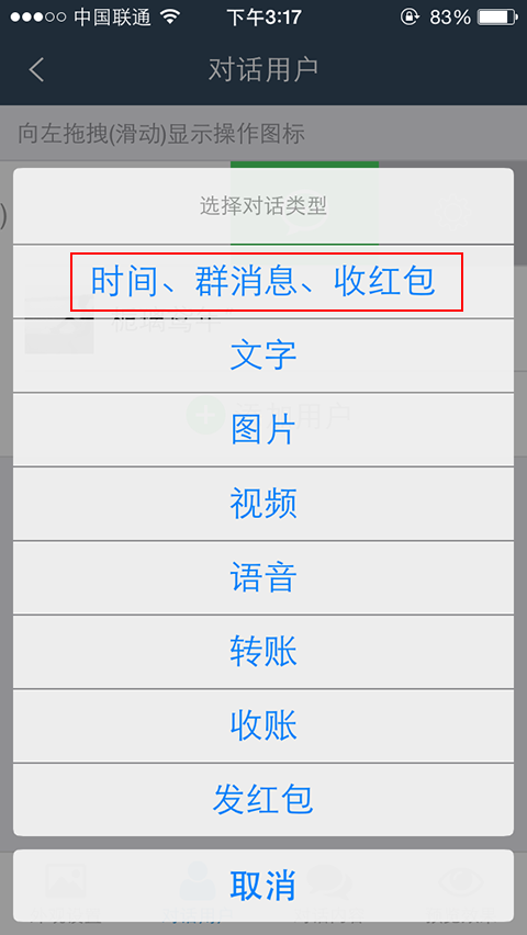 在弹出的菜单中,选择“时间、群消息、收红包”菜单