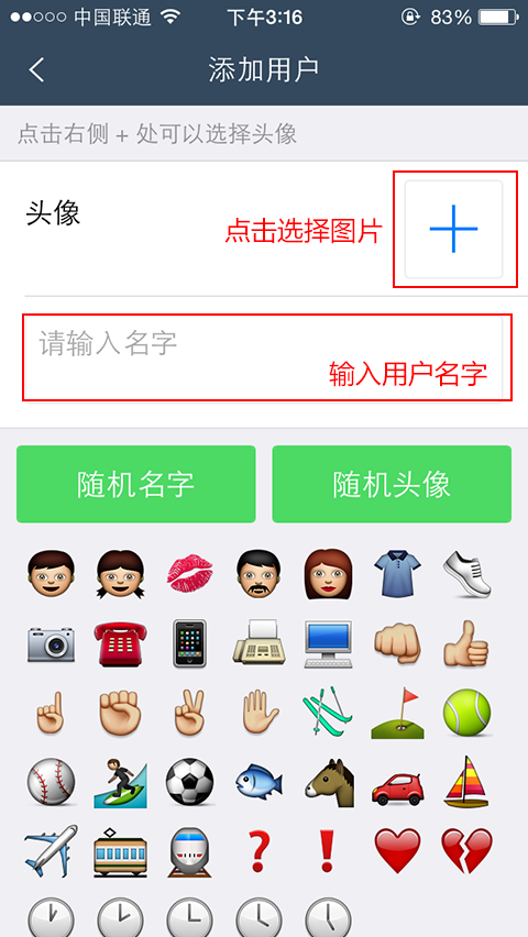 点击“+”区域,选择图片设置用户头像,在下面输入框输入用户名字,点击保存