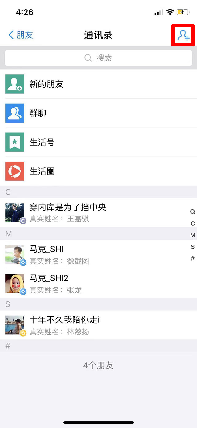 2.进入支付宝通讯录页面,点击右上角添加用户按钮